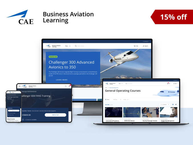 Exclusively for SIMCOM customers! Get 15% off any General Operating or Bombardier aircraft-specific CAE eLearning course by adding the code SIMCOM15 at checkout. CAE eLearning courses empower you to take learning and safety into your own hands with more than 80 courses covering General Operating and Bombardier aircraft-specific courses. It is now easier and more convenient than ever to purchase eLearning courses directly from BusinessAviationLearning.cae.com in 4 simple steps: